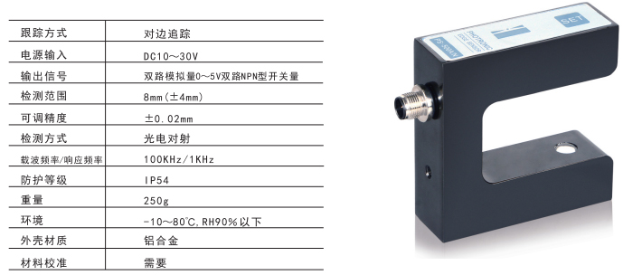 1.支持模擬量/開關量輸出 2.適用于不透明、透明薄膜的追邊應用 3.可見光對射 4.100k頻率載波編碼,不受環境光線影響 5.檢測范圍5mm,檢測精度0.02mm 6.高穩定性,高精度